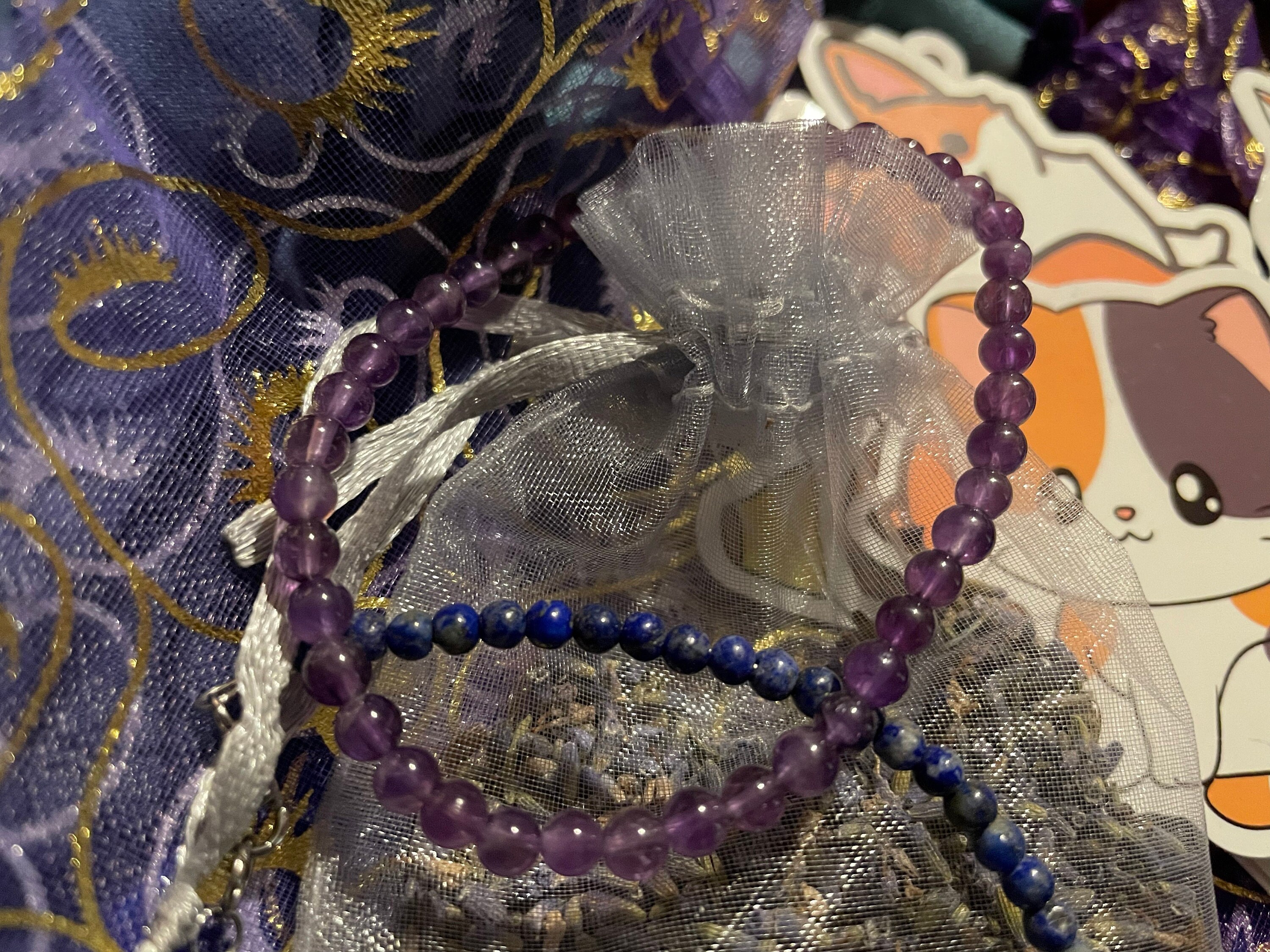 Your Amethyst bracelet arrives in a purple organza bag, complete with a handmade lavender + satin spar (selenite) cleansing sachet and fun stickers — perfect for gifting or personal use.