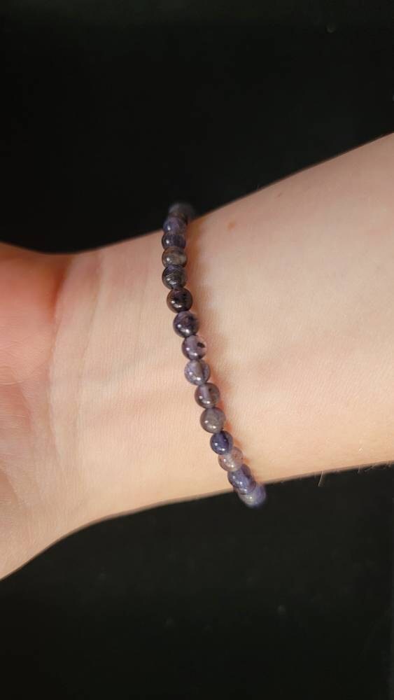 The deep blue and violet hues make this 4mm Iolite bracelet a versatile piece that layers beautifully or stands alone as a subtle yet striking statement.