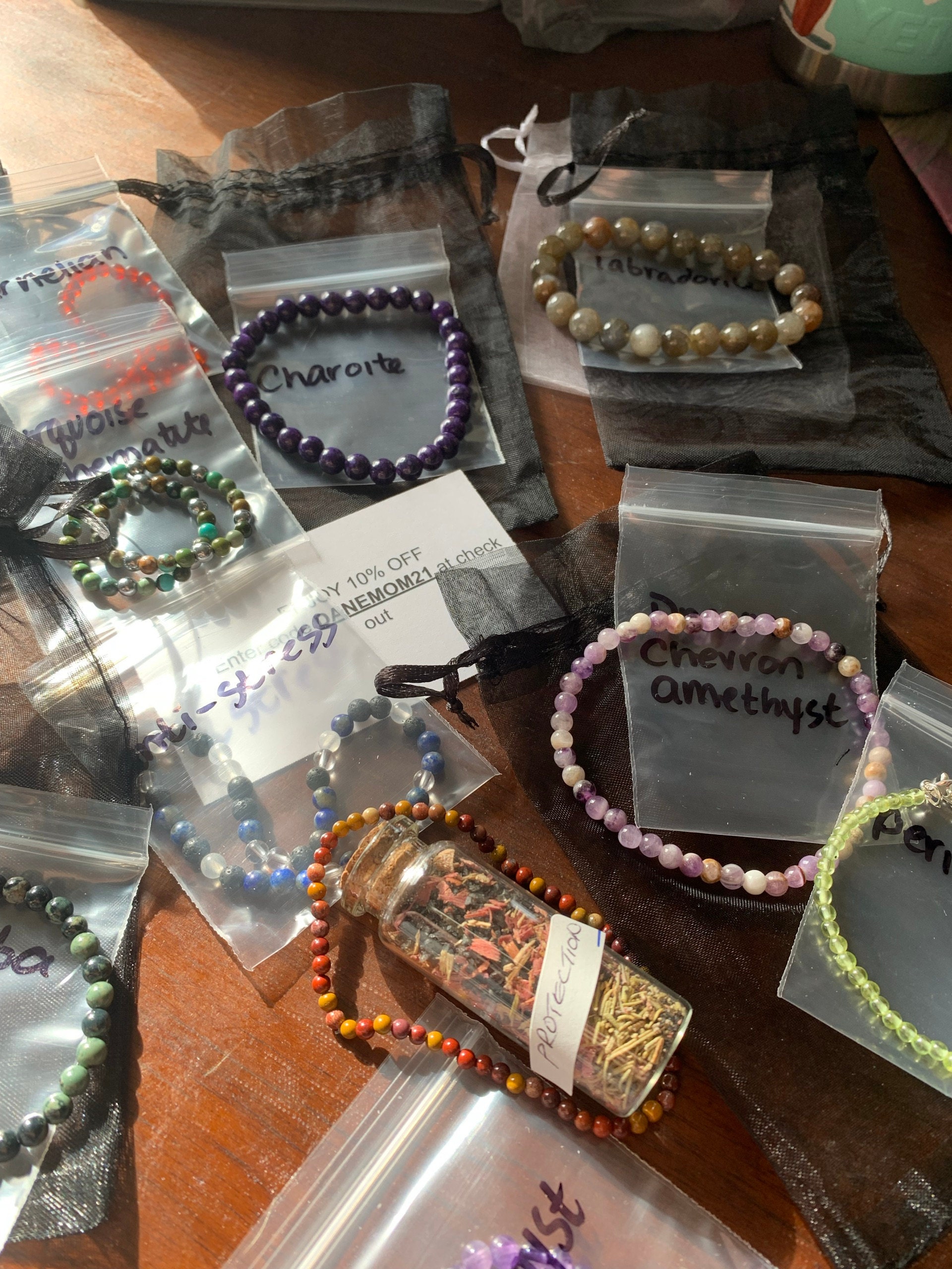 Your Mookaite Jasper bracelet arrives in a purple organza bag, complete with a handmade lavender + satin spar (selenite) cleansing sachet and fun stickers — perfect for gifting or personal wear.