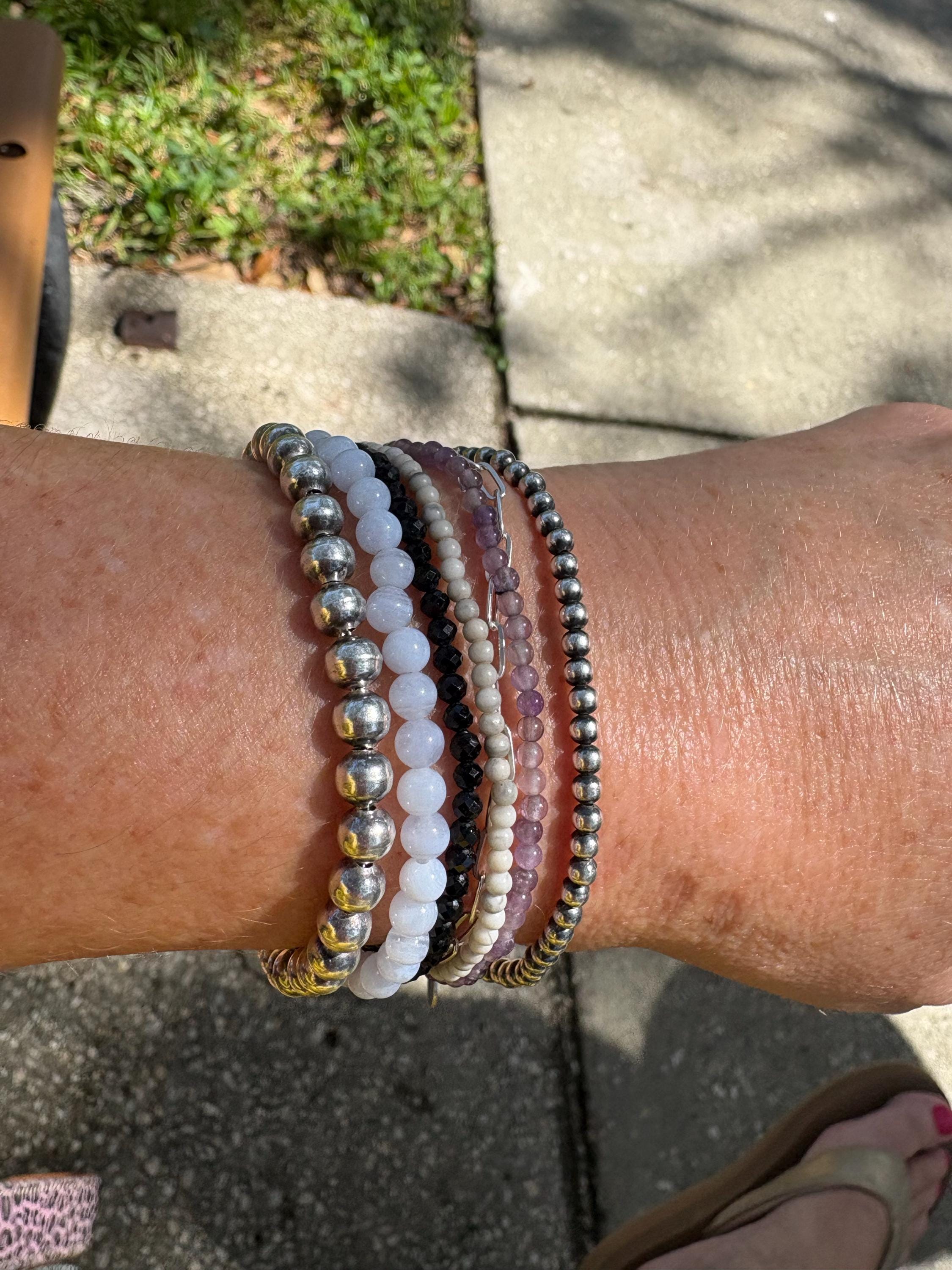 The combination of banded and solid beads makes this 4mm Blue Lace Agate bracelet a versatile piece that layers beautifully or stands alone as a soothing, elegant statement.