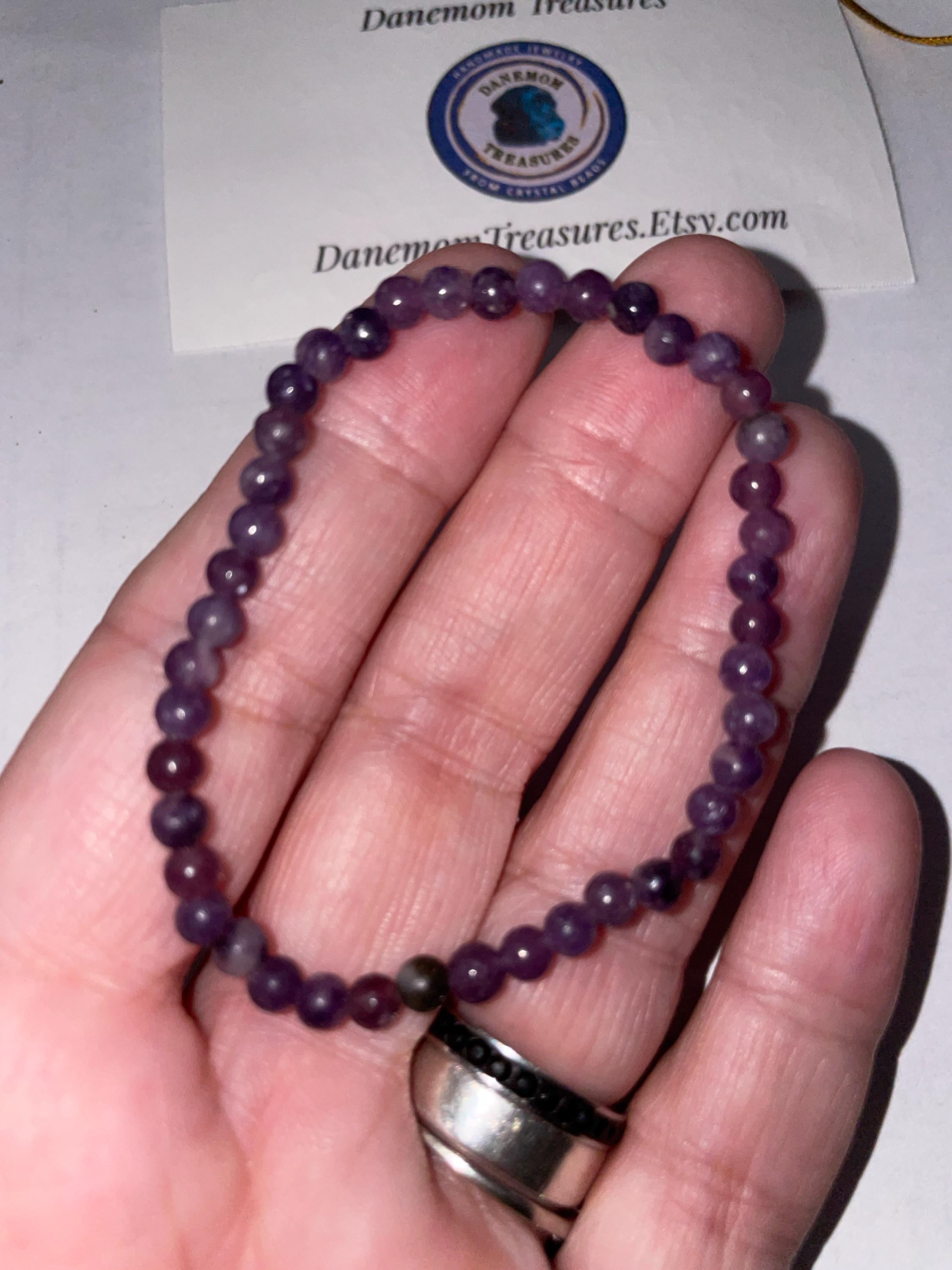 The soft purple tones of this 4mm Lepidolite bracelet pair beautifully with stones like Amethyst, Rose Quartz, Moonstone, or Clear Quartz.