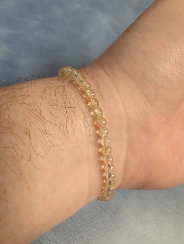 This 4mm Citrine crystal bead stretch bracelet features polished, sunny lemon yellow beads that sparkle with natural warmth and energy. Known as a stone of joy and abundance, Citrine is valued for its uplifting energy, manifestation properties, and its ability to boost confidence, optimism, and personal growth.