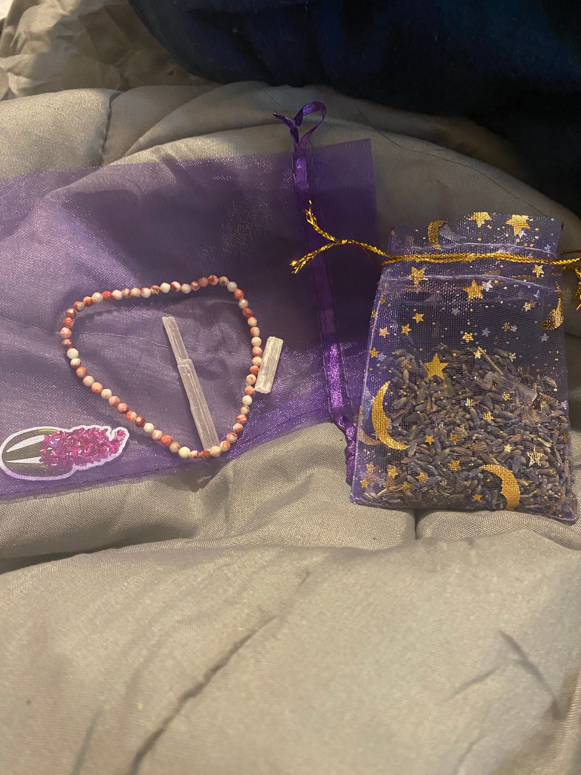 Your Cinnabrite bracelet arrives in a purple organza bag, complete with a handmade lavender + satin spar (selenite) cleansing sachet and fun stickers — perfect for gifting or personal use.